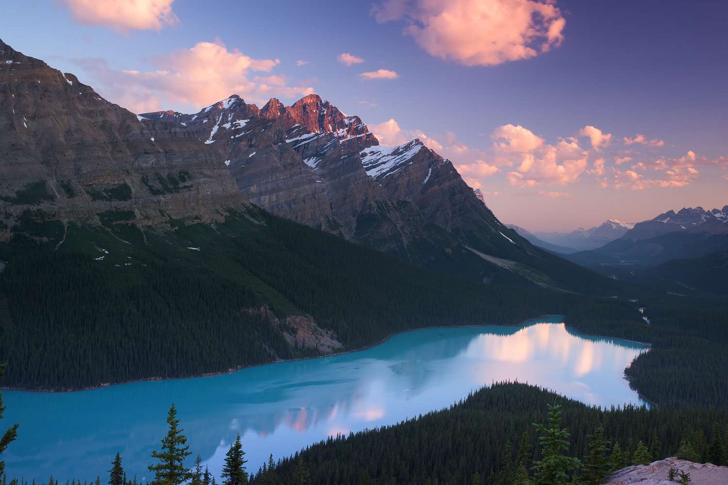 Banff National Park is known for its spectacular sunrises. The mountains and lakes found in this area heighten the beauty of the sunrise as it reflects off of its mountainous jagged peaks and the pristine turquoise waters of its glacier lakes. Tourists and artists flock to this area of the country to experience and capture sunrises. There are many sites in this national park to view sunrises, but some of the most highly rated are found at Moraine Lake, Lake Louise, Peyto Lake, Tunnel Mountain Viewpoint and Two Jack Lake.