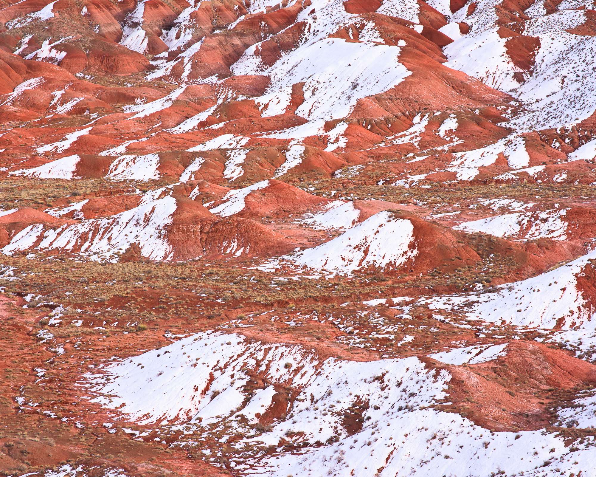 Photographed from a high elevation the red hills below covered in snow form a pattern in nature. The snow contrasts the peaks showing form and depth.